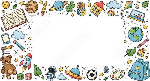 Educational border illustration, space theme, planets, rocket, astronaut, school supplies, creativity, childhood learning, playful vector artwork