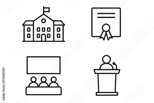 educational, icon, school, certificate, presentation, dais, building, award, ribbon, audience, speaker, lecture, seminar, emblem, learning, cognition, achievement, conference, teaching, instruction, academic, institution, formal, classroom, education, training, diploma, panel, debate, illustration, graphic, outline, simple, minimal, design, monochrome, concept, vector, icon