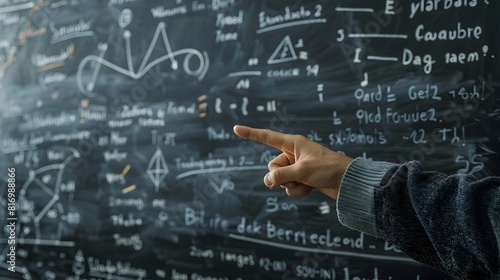 Educator Pointing at Chalkboard Filled with Educational Diagrams and Formulas