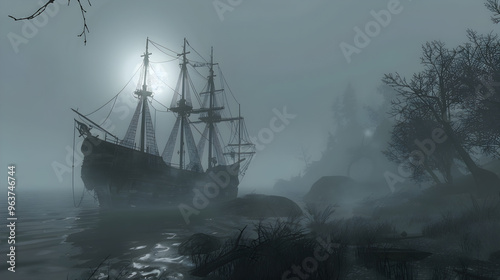 Eerie ghostly ship gliding through fog on mysterious waters, a hauntingly beautiful sight to behold.