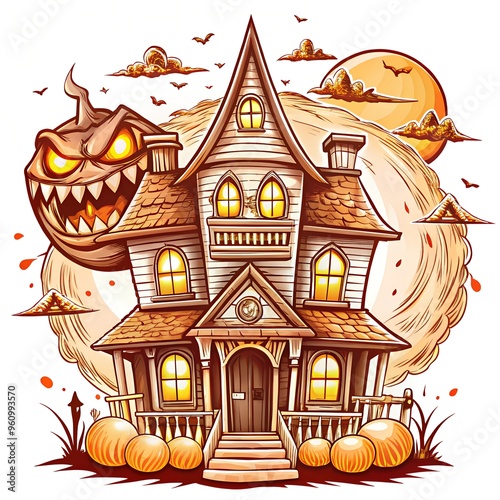 Eerie Haunted House with Jack-o-Lantern Moon and Witch Silhouette