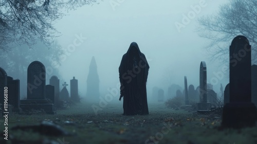 Eerie Hooded Figure Walking Through a Foggy Cemetery at Dusk