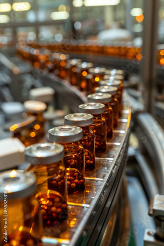 Efficient manufacturing process at pharmaceutical factory with medical vials on production line
