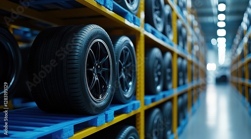 tire, wheel, automotive, warehouse, storage, logistic, organisation, optimization, efficiency, accessibility, inventory, management, system, stacking, arrangement, space, utilization, modern, technology, distribution, transportation, industry, shelving, pallet, rubber, alloy, vehicle, car, truck, motorcycle, part, component, aftermarket, retail, wholesale, shipping, handling, safety, security, quality, control, maintenance, repair, substitution, performance, durability