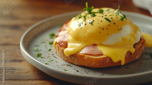 Egg Benedict toast with hams and chopped parsley on a modern plate, minimalist food photography, breakfast idea, homemade healthy menu cooking