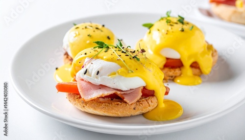 eggs benedict, a delicious brunch dish with poached eggs, ham, and hollandaise sauce, artfully presented on a plate