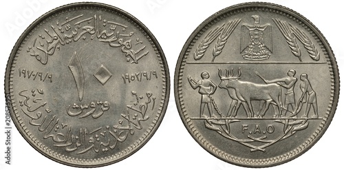 Egypt Egyptian coin 10 ten piasters 1970, subject Food and Agricultural Organization, face value divides dates, country name and face value in Arabic, ancient peasants plowing with bulls, eagle on top