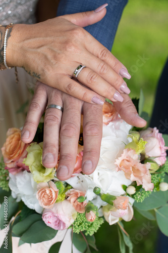 wedding, wedding band, bouquet, hand, love, bride, couple, groom, flower, marriage, ring, married, woman, rose, ceremony, romance, husband, gold, celebration, nail