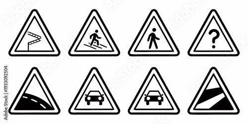 Eight different types of warning signs with unique symbols and colors Vector