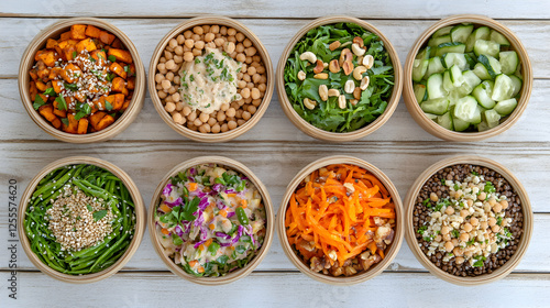 Eight healthy and delicious salad bowls filled with fresh vegetables, legumes, and nuts, arranged on a rustic white wooden background. Perfect for a health-conscious lifestyle or a vibrant food blog.