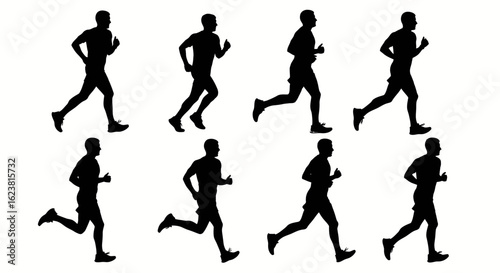 Eight silhouettes of men running against a white background in a repeating pattern formation style