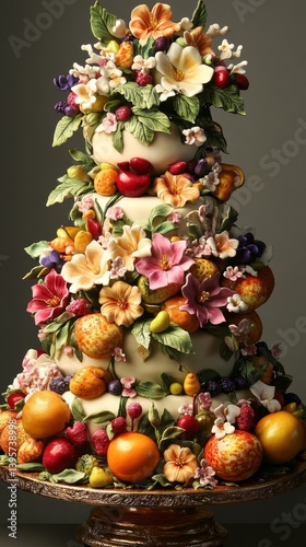 Elaborate floral and fruit arrangement on a stand against a dark background.