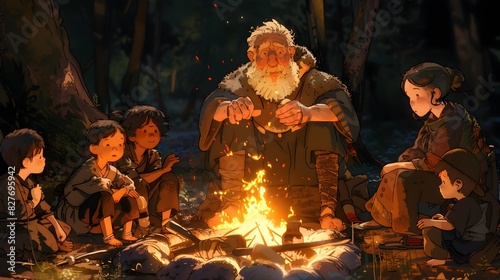 campfire, storytelling, elder, children, night, fire, flames, family, history, tale, folk, tradition, gathering, cosy, outdoors, nature, adventure, group, classic, magical, animation, folklore, legend, balefire, illumination