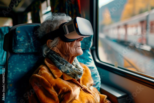 futuristic, elder, woman, old, caucasian, train, goggles, technology, innovation, advanced, digital, cyberspace, modern, elderly, life events, interface, futurism, journey, transport, device, imagery, cyber, goggles, high technology, mobility, simulated, concept, senior, wireless, age, person, travelling, trip, station, stress, traffic, passenger, pensioner, ride, sitting, emotion, portrait, 1