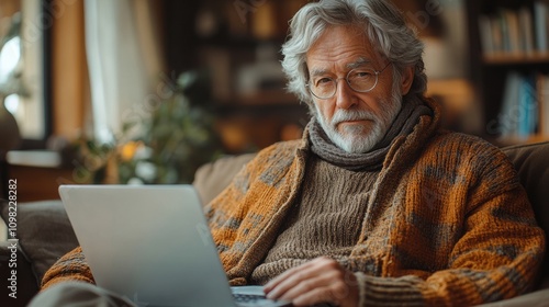 Elderly man with white beard reading laptop, cozy home, casual sweater, relaxed lifestyle, senior enjoying technology, warm living room, bright natural light, comfort