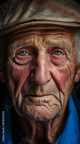 Elderly man with wrinkled skin and expressive blue eyes, wearing a cap, showcasing wisdom.