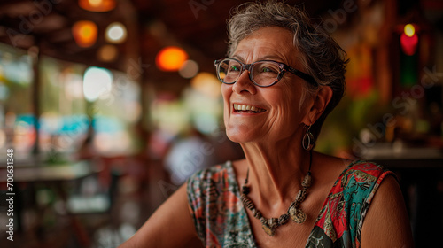 Elderly woman, 65 years old, wearing glasses in a simple environment