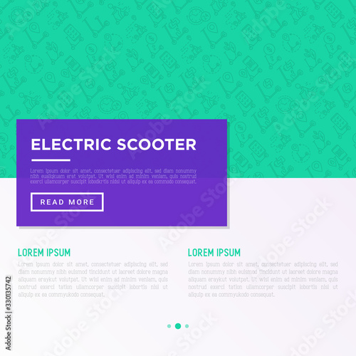 Electric scooter concept with thin line icons: sharing service, mobile app, QR code, parking, helmet, eco transport, pointer. Modern vector illustration, template with copy space.