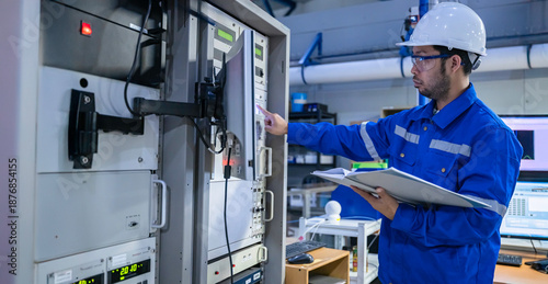 Electrical engineer male checking voltage at the Power Distribution Cabinet in the control room,preventive maintenance Yearly,inspecting power system and control panel in industrial factory