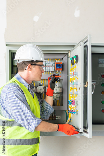 Electrician installing electrical wires and multimeter fuse switch box in hands of electrician detail