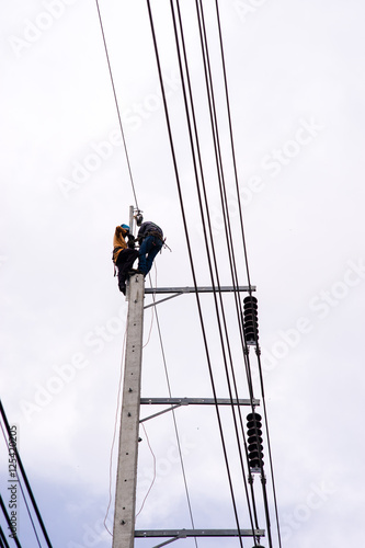 Electrician lineman repairman worker at climbing work on electric post power pole