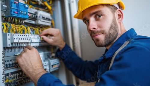 electrician, man, work, panel, electrical, wiring, hand, tool, safety, yellow, helmet, blue, uniform, sharpened, close, up, professional, skilled, equipment, maintenance, repair, technician, expertise, concentrated, detail, precise, installation, connection, wire, control, box, circuit, modern, workplace, focused, serious, closeup, industry, job, effort, safety-gear, professionalism, cautious, competent