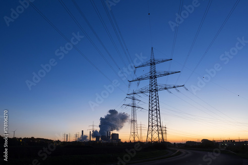 power plant, electric, electricity, energy, voltage, pylon, environment, silhouette, structure, industry, high, sky, supply, line, technology, power, cable, engineering, blue, sunset, tower, electrical, steel, evening, infrastructure, pole, industrial, landscape, plant, substation, architecture, line, orange, steam, coal, fired, street, german, factory, station, pollution, sunrise, sun, dusk, night, dawn, red, fire, gold