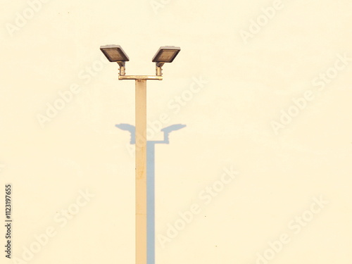 Electricity Technology, Modern LED Street Light Pole with Shadow on Wall. LED Street Light on Yellow Wall Background. Cloud Background. Outdoor LED Light. Solar Panel Street Light - Eco Friendly.