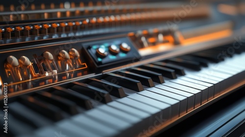 keyboard, key, piano, synthesizer, instrument, music, musical, electronic, technology, buttons, knob, control, panel, digital, audio, sound, studio, recording, dark, orange, light, glow, metallic, texture, detail, closeup, modern, vintage, retro, design
