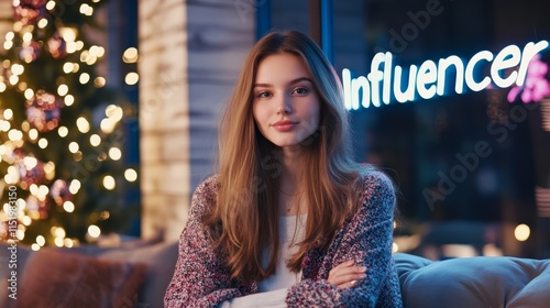 elegance pretty woman at cozy home with word " Influencer " on wall