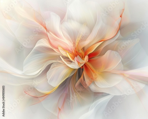 Elegant abstract flower, petals in soft hues of white, peach, and orange, flowing gracefully in a dreamy, ethereal composition against a light background.