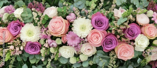 Elegant arrangement of pink and purple roses white Lisianthus and assorted flowers on lush green background for floral decor or design use