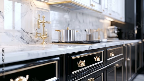 Elegant black and white kitchen with marble countertop and gold fixtures, blending modern luxury with timeless design