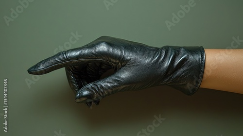Elegant black leather glove pointing gracefully against a muted green background