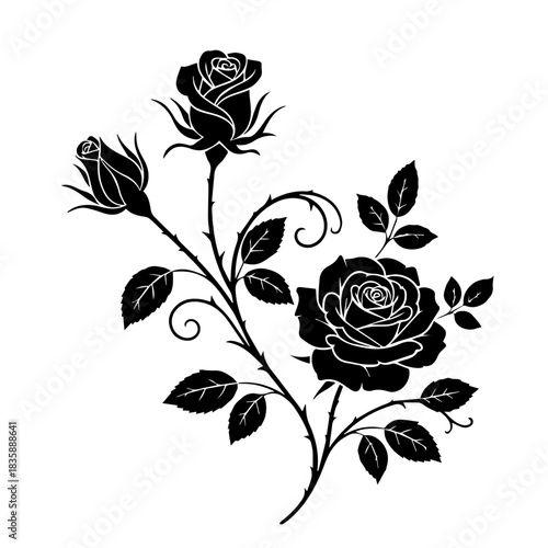 Elegant black rose silhouette illustration Blooming flower with leaves and thorns