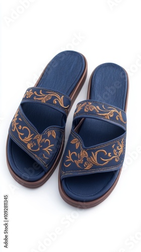 Elegant blue sandals with intricate floral design, isolated on white background.