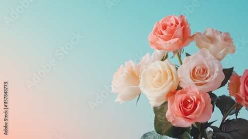 Elegant bouquet of pastel roses against a soft gradient background with copy space