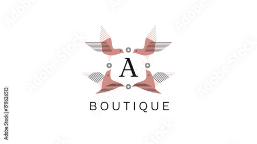 Elegant boutique logo design features a central letter A surrounded by stylized birds in soft pink and black line art.