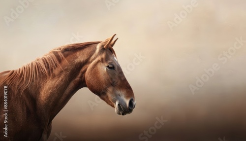 Elegant brown horse facing left against a soft beige background, showcasing its sleek mane and profile.