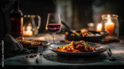 pasta, red wine, romantic, elegant, cosy, wine glass, dining, candlelight, appetising, indulgent, table setting, relaxation, comfort food, culinary, homemade, dinnerware, gastronomy, fine dining, culinary arts, food photography, luxurious