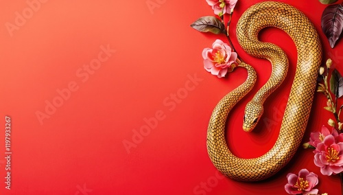 chinese, new, year, snake, gold, flower, red, festive, traditional, celebration, culture, lunar, decoration, holiday, elegant, oriental, prosperity, symbolic, floral, heritage, auspicious, vibrant, colourful, cheerful, richness, design, asian, creative, harmony, luxury, brightness, happiness, uniqueness, ornamental, gold, animal, isolated, abstract, studio, snake, nature
