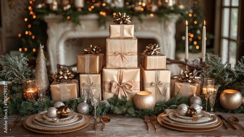 christmas, gift, present, gold, elegant, table, setting, candle, greenery, festive, holiday, winter, decoration, ornament, champaign, goggles, plate, silverware, pine, cone, bow, ribbon, luxury, celebration, joy, family, home, cosy, warm, romantic, sparkle, shimmer, light, fire, fireplace, tree, wooden, rustic, style, design, arrangement, beautiful, magical