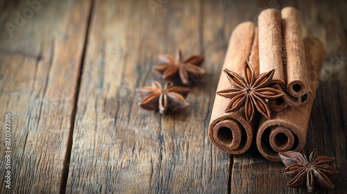 Elegant Cinnamon Sticks and Star Anise Spices on Rustic Wooden Surface for Culinary and Aromatic Themes