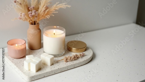 Elegant composition of white candles and dried flowers in soft natural lighting. Aesthetic home decor scene perfect for relaxation, hygge lifestyle, and minimalist interior inspiration