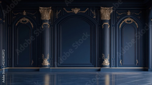 interior, design, room, architecture, palace, luxury, gold, blue, dark, elegant, classic, royals, grand, opulent, ornate, decor, column, paneling, wall, molding, trim, flooring, marble, glossy, arch, detail, texture, style, rich, sophisticated, formal, majestic, expensive, artistic, aesthetic, home, house, building, luxury home, estate
