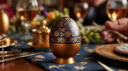 egg, decorative, ornamental, gold, blue, floral, pattern, dining, table, centrepiece, celebration, elegant, festive, dinner, tablecloth, glassware, wine, plate, utensil, silverware, luxury, gathering, meal, detailed, crafted, artistic, holiday, fancy, traditional, formal, entertaining, decoration, setting, ambience, sophisticated, home, interior, design