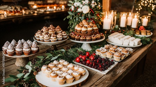 dessert, table, elegant, arrangement, sweet, cupcake, pastry, fruit, decoration, holiday, festive, candle, greenery, dessert, party, celebration, treat, epicure, catering, display, variety, food, presentation, edible, styling, seasonal, ingredient, berry, joyful, gathering, colours, favor, ambience, rustic, charme, indulgence, delicious, appetising, setting, inviting, cosy, warmth, hospitality, craftsmanship