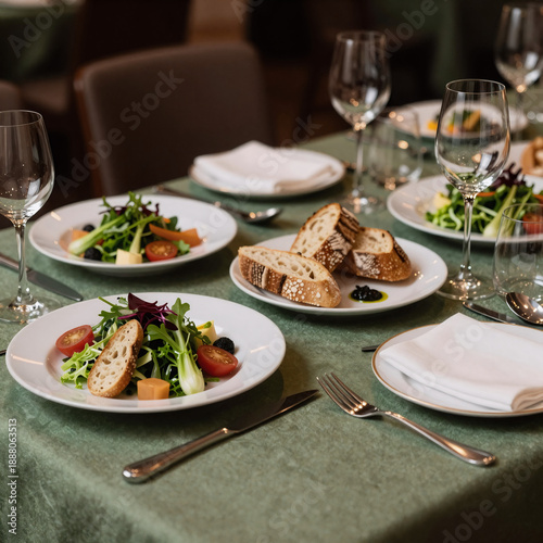 Elegant dinner setting featuring salad and bread on a green table at an evening event