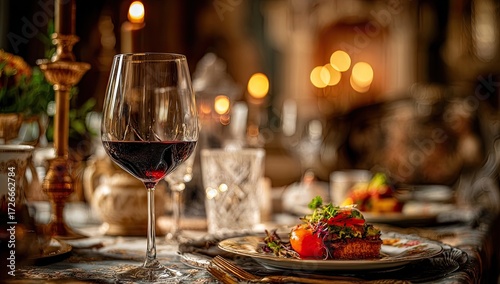 dining, table, wine, glasses, red, food, plate, decor, candle, ornament, room, luxury, elegant, formal, dinner, party, setting, eatery, ambience, light, warm, dish, meat, vegetable, tomatoes, salad, arrangement, crystal, utensil, gold, porcelain, floral, candlelight, rich, fine, detail, sharpened, background, blurred, sophistication, sophisticated, festive, celebration, special, celebratory, vintage, opulence, romance