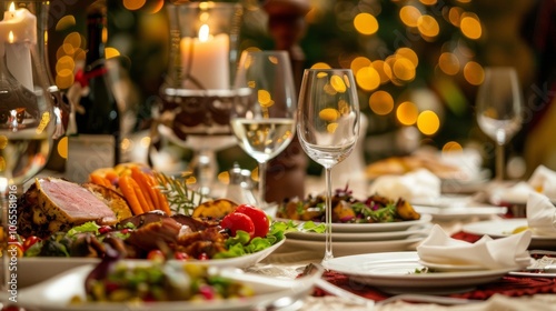 Elegant dinner table set for a festive celebration with gourmet dishes, wine glasses, and soft ambient lighting.